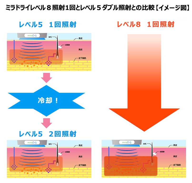 レベル5ダブル照射とレベル8広範囲ミラドライとの比較